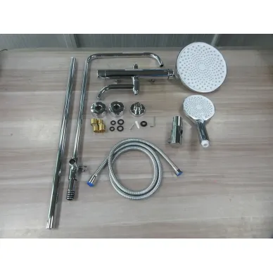 - Комплектация: смеситель, шланг, держатель, лейка, стойка, верхний душ, излив