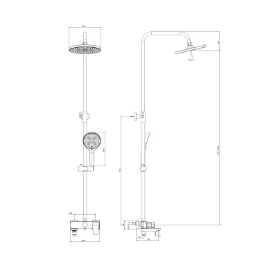 - Комплектация: смеситель, кронштейн, шланг, держатель, лейка, стойка, верхний душ