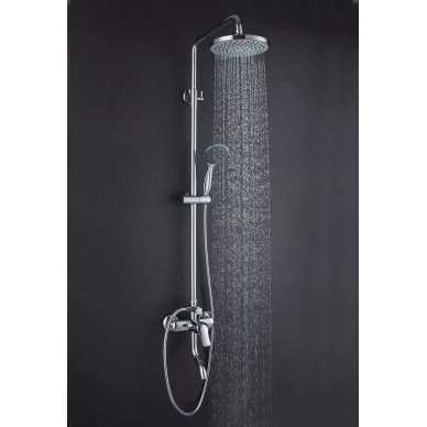 - Комплектация: смеситель, шланг, держатель, лейка, стойка, верхний душ