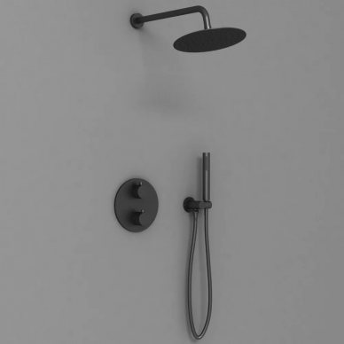 - Комплектация: смеситель, термостат, кронштейн, шланг, держатель, лейка, верхний душ