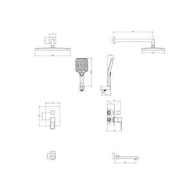 - Комплектация: смеситель, кронштейн, механизм, шланг, держатель, лейка, верхний душ, излив