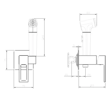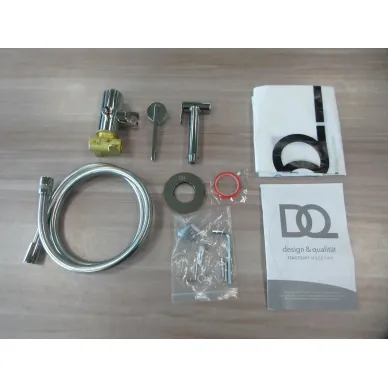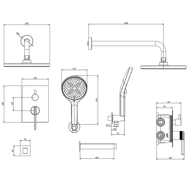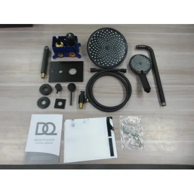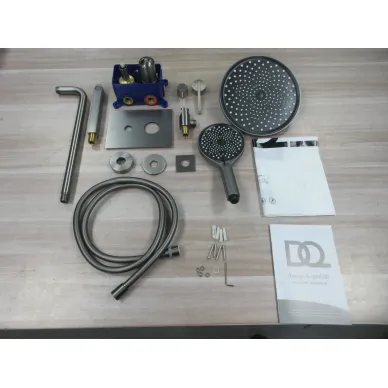 - Комплектация: смеситель, кронштейн, шланг, держатель, лейка, верхний душ