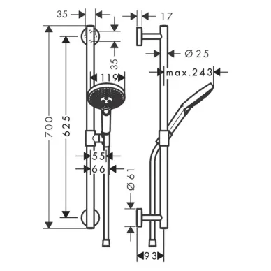 - Комплектация: смеситель, термостат, шланг, держатель, лейка, стойка, верхний душ