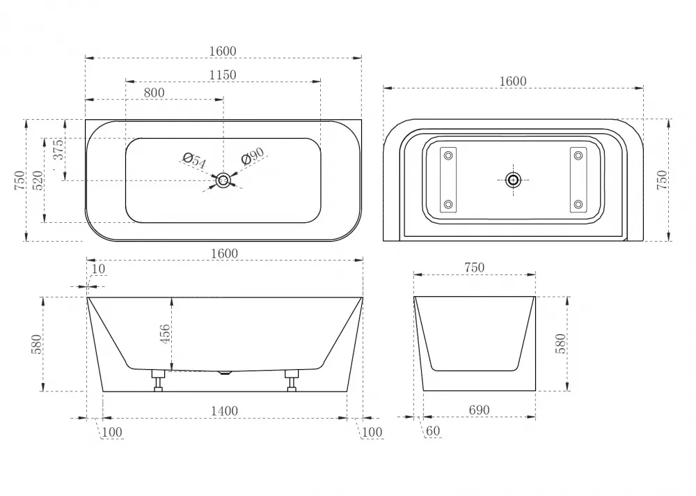 - Размер ванны (ШхВхД): 75х58х160 см.