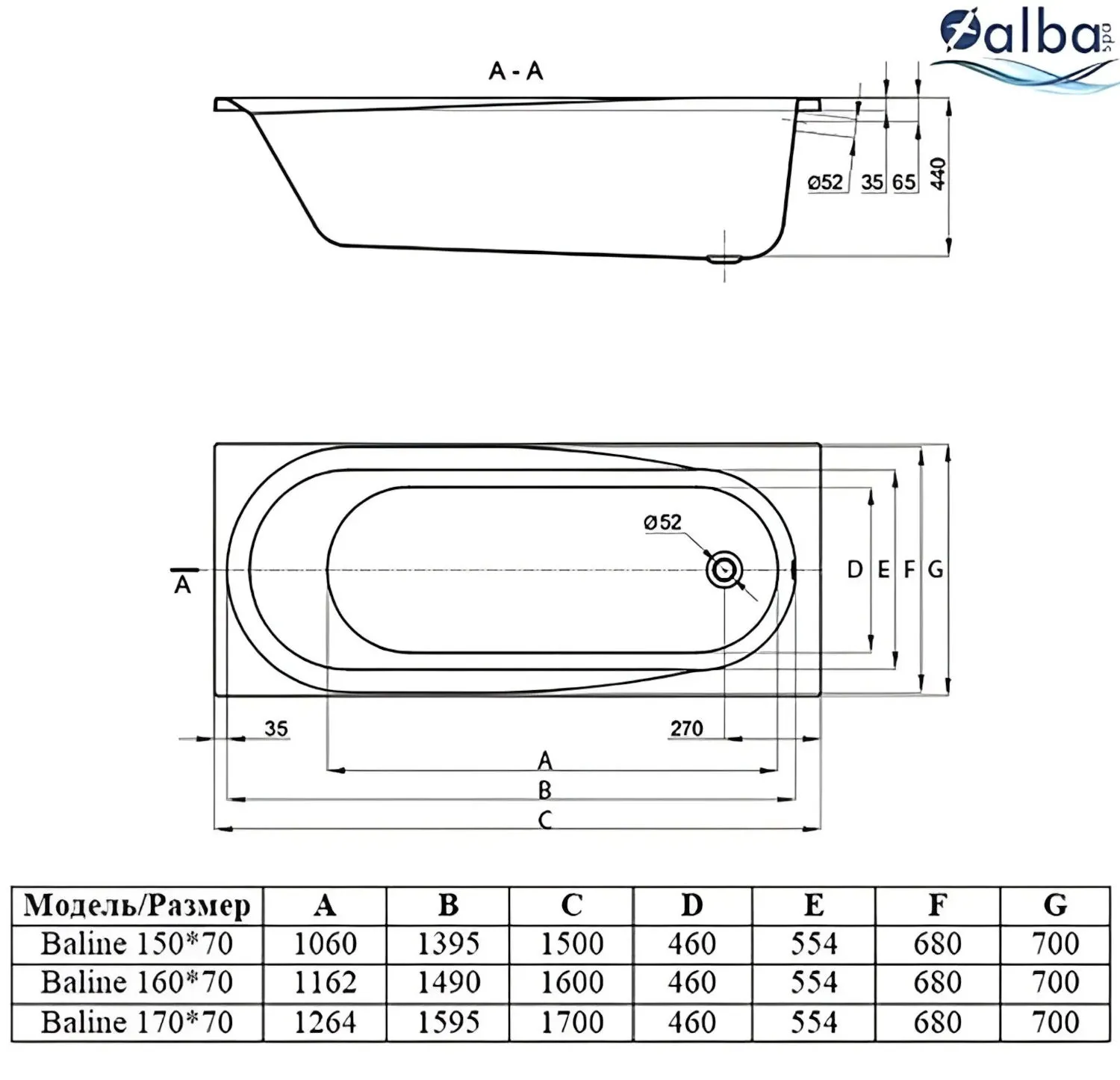 Акриловая ванна Alba Spa Baline ВПР0010000100 150x70, белая