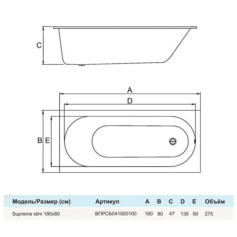 Акриловая ванна Alba Spa Supreme Slim ВПРСБ041000100 180x80, белая