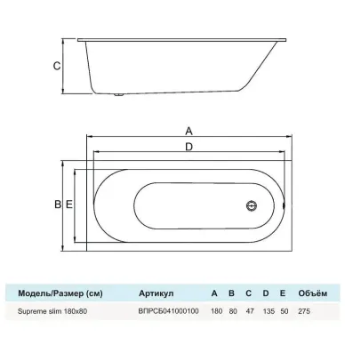 Акриловая ванна Alba Spa Supreme ВПР041000100 180x80, белая
