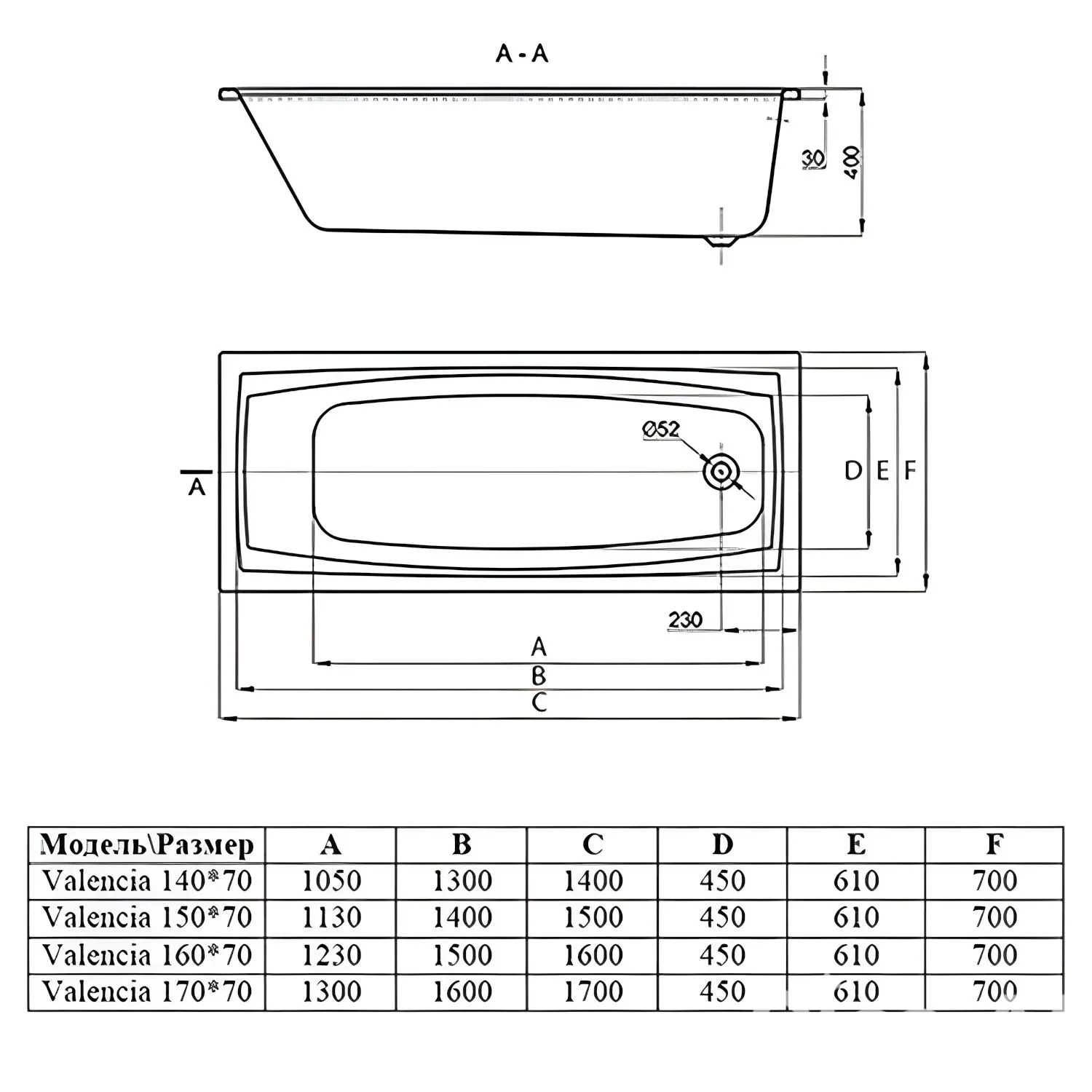 Акриловая ванна Alba Spa Valencia ВПР0050000100 150x70, белая