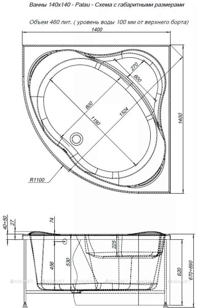 Акриловая ванна Aquanet Palau 00205535 140x140 см, без гидромассажа с каркасом