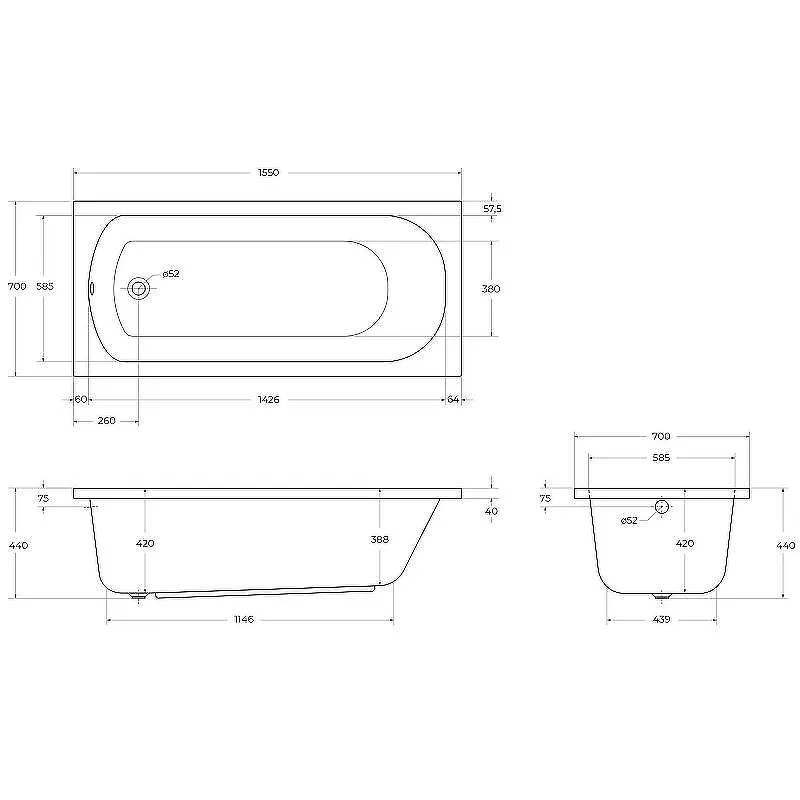 - Размеры чаши ванны (ШхВхД): 700х600х1550 мм.