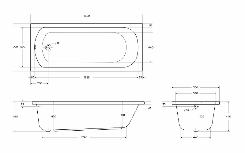 - Размеры чаши ванны (ШхВхД): 700х600х1650 мм.