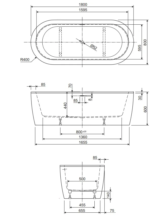 - Диаметр слива: 52 мм.