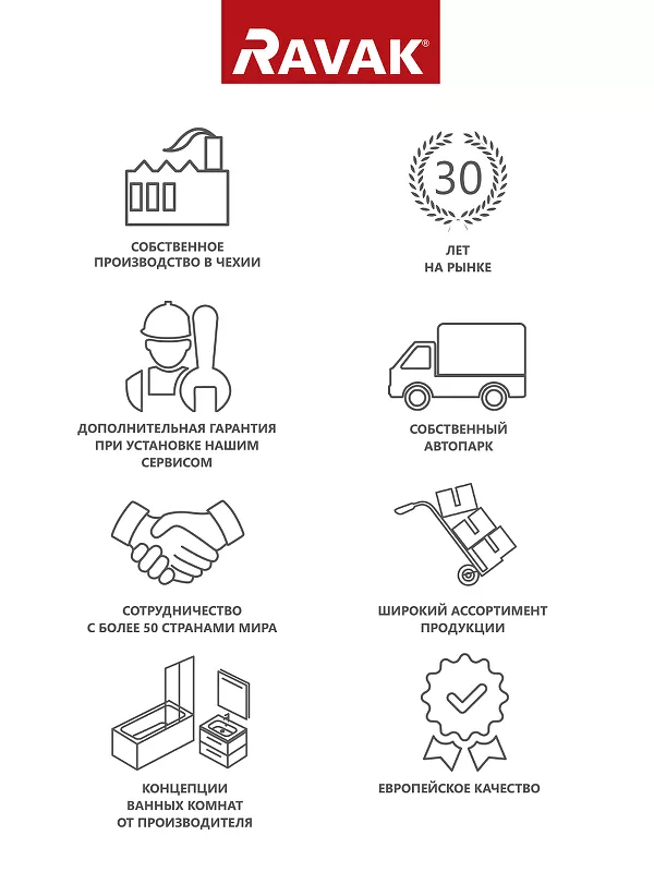 Привычную симметрию прямоугольной формы дизайнер намеренно изменил, сделав один край шире другого. Таким образом ванна приобрела новое выражение. Ванна имеет невысокую переднюю часть и борта предназначена для встраивания в подиум с использованием облицовки из искусственного камня, дерева или для декорирования керамикой. Для производства ванн RAVAK использует литой акрил. Изготовленные из него изделия длительное время сохраняют свою форму, не искривляются и не трескаются. Имеют высокоглянцевую и непористую поверхность, которая легко моется и обладает антибактериальными свойствами.