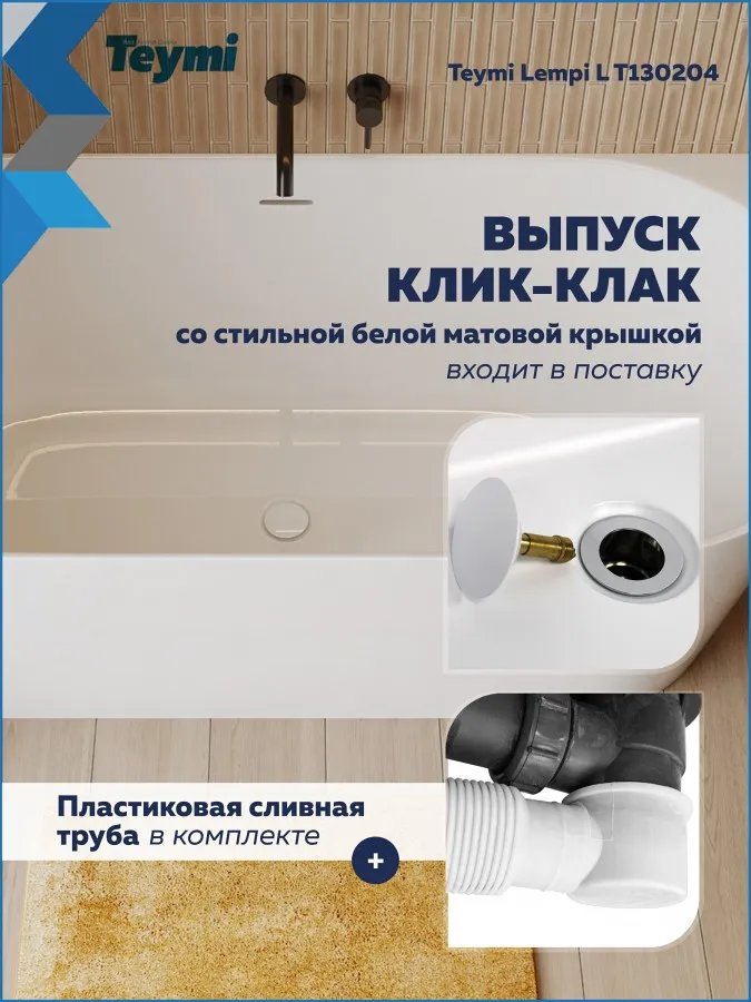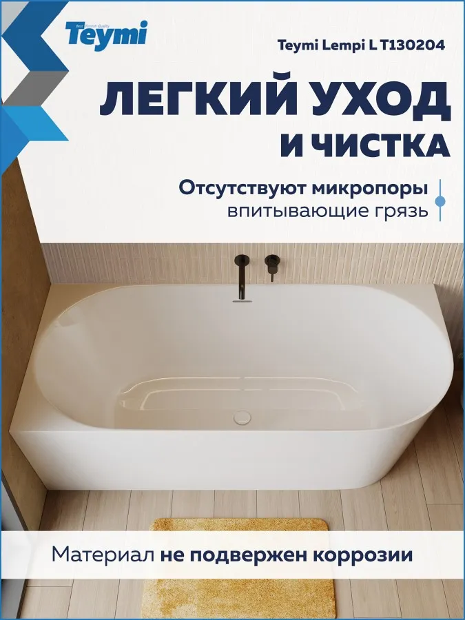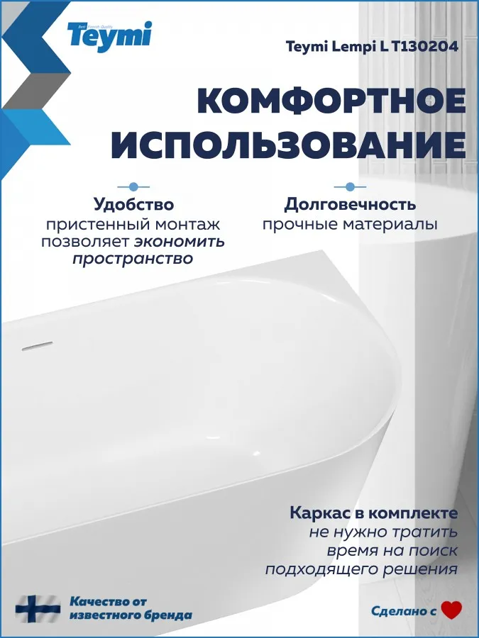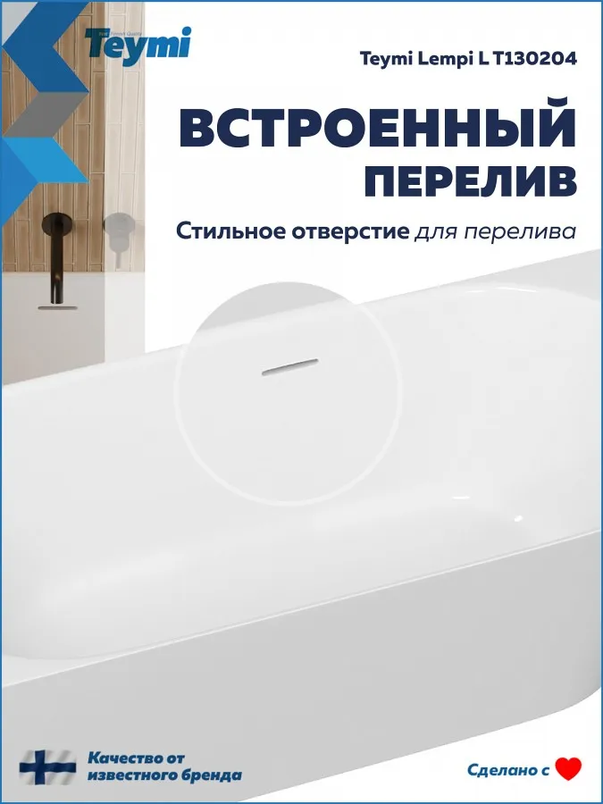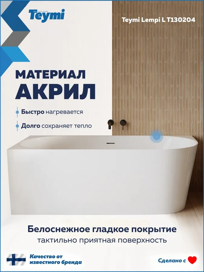 Превратите вашу ванную комнату в пространство скандинавского спокойствия и стиля с ванной Teymi Lempi L. Эта модель от финского бренда — идеальный компромисс между роскошью отдельностоящих ванн и практичностью классических решений. Благодаря продуманной пристенной конструкции она экономит пространство, сохраняя при этом элегантный современный вид.