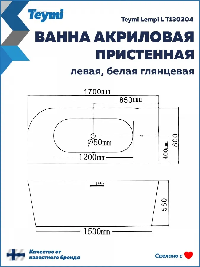 Акриловая ванна Teymi Lempi L T130204 170x80, пристенная, левая, белая