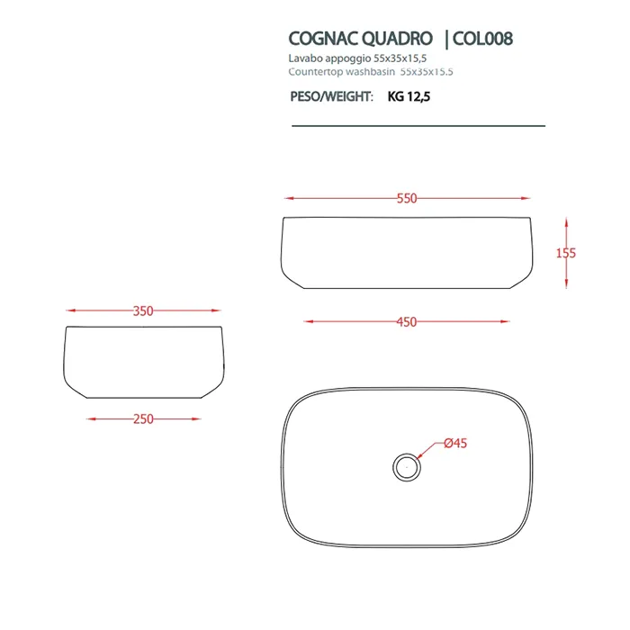 Artceram Cognac Раковина накладная Quadro 55x35 см, saniglaze, цвет: белый матовый COL008 05 34