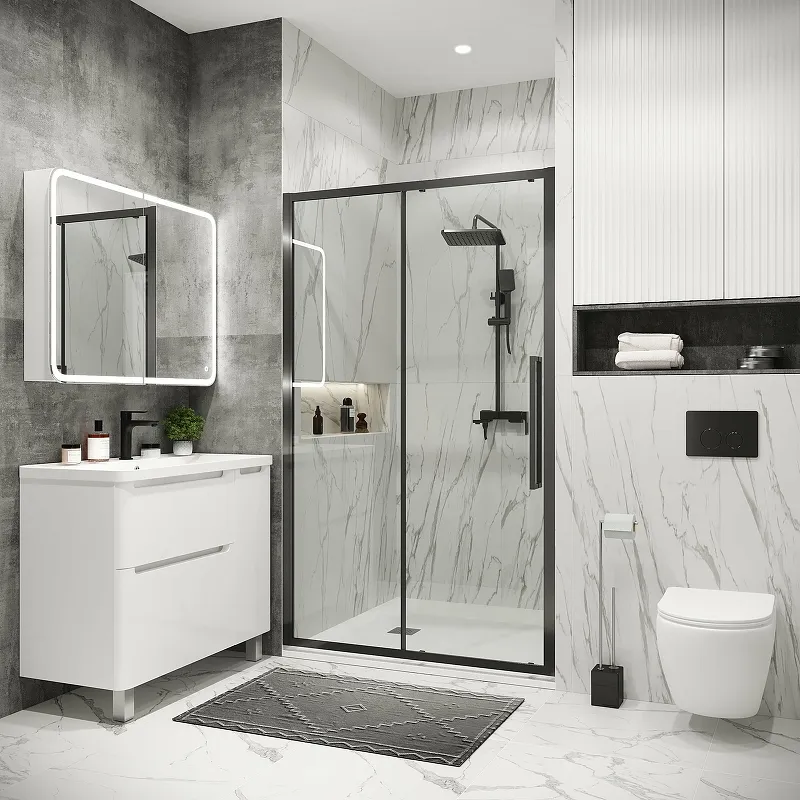 - Регулировка ширины предусмотрена за счет боковых профилей, что позволяет без проблем установить изделие даже при кривизне стен.