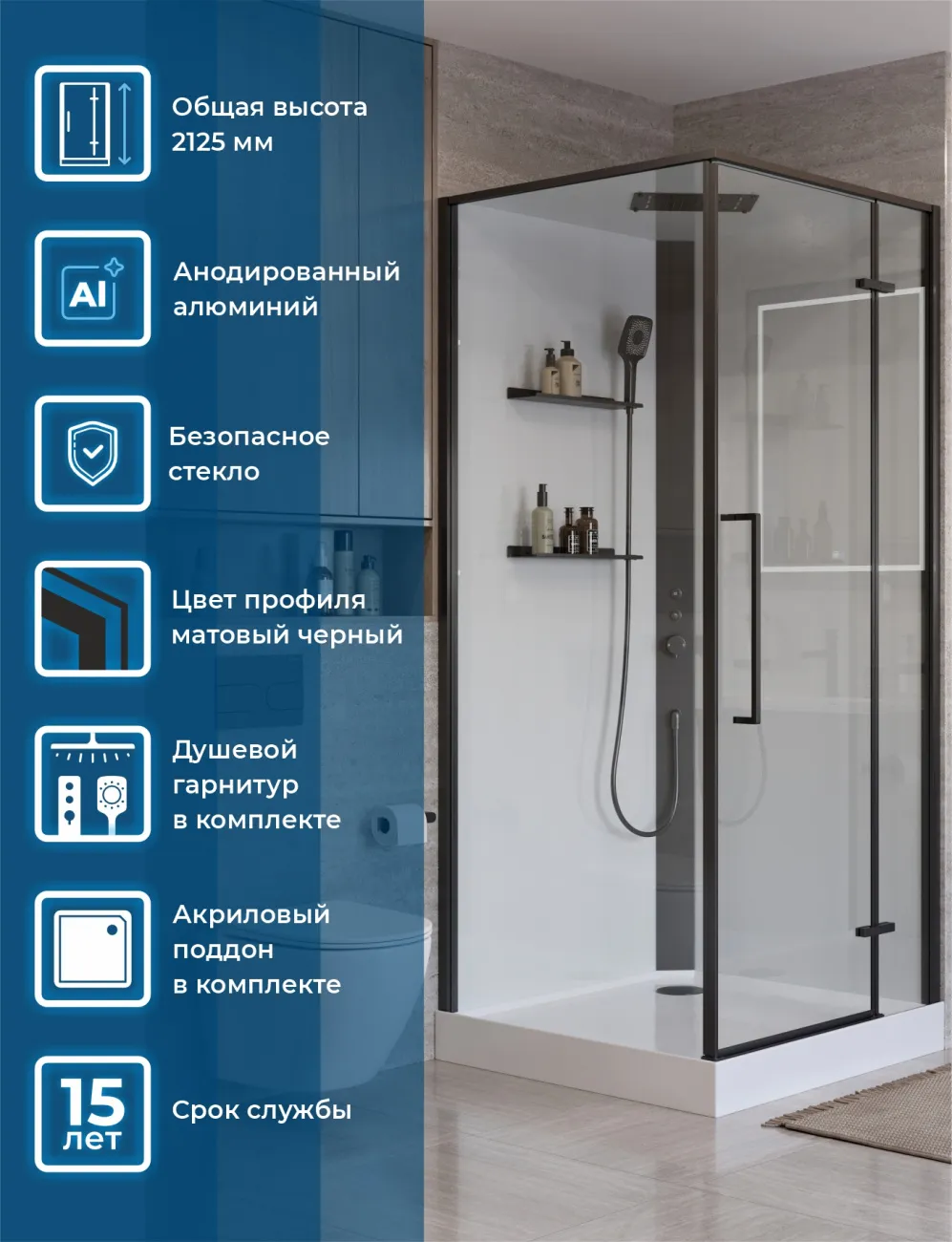 - Кабина имеет компактные и удобные габариты — 900×900 мм по основанию и высоту 2125 мм, что позволяет ей вписаться даже в небольшое пространство стандартного санузла.