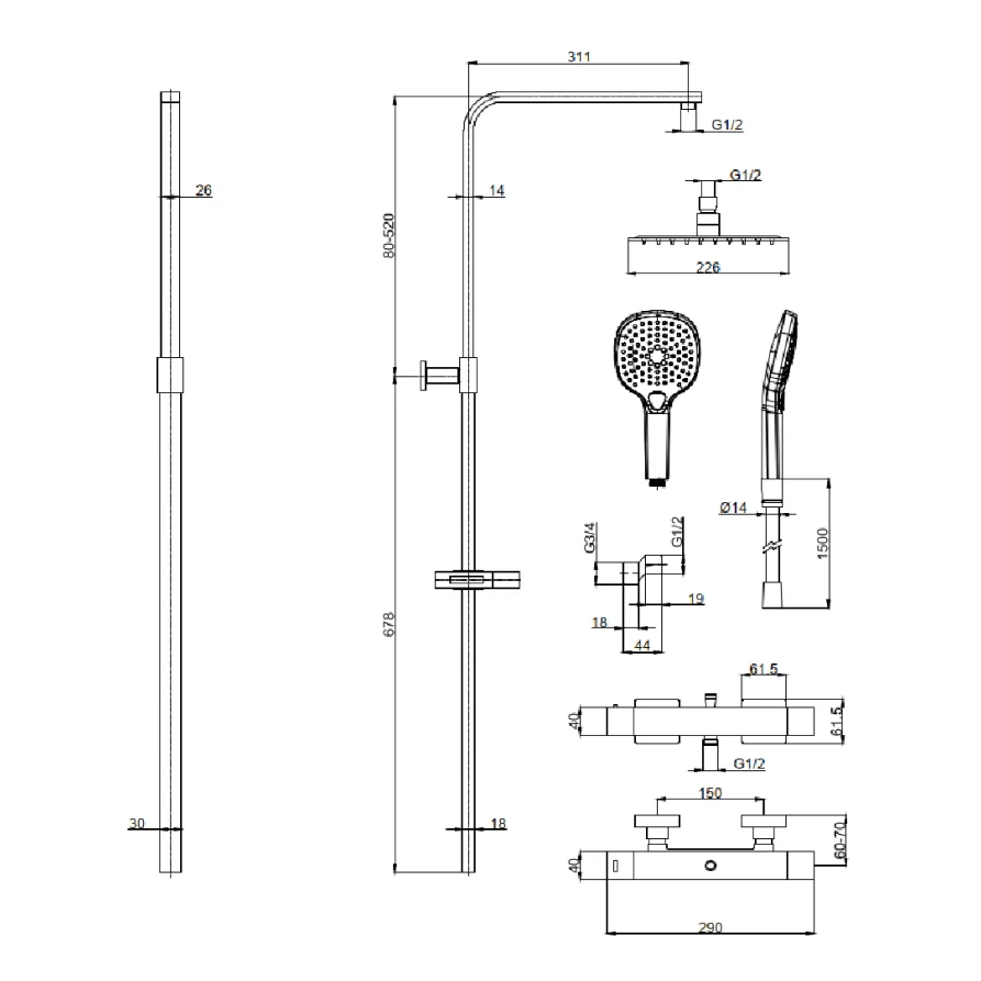 Система состоит из верхнего душа, ручного душа, термостатического смесителя для ванны и душа, штанги для душа, держателя для душа