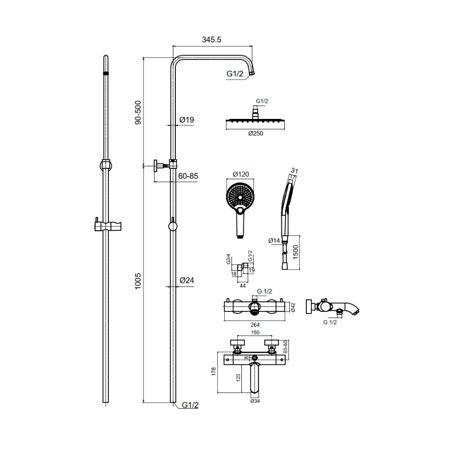 Система состоит из верхнего душа, ручного душа, термостатического смесителя для ванны и душа, штанги для душа, держателя для душа