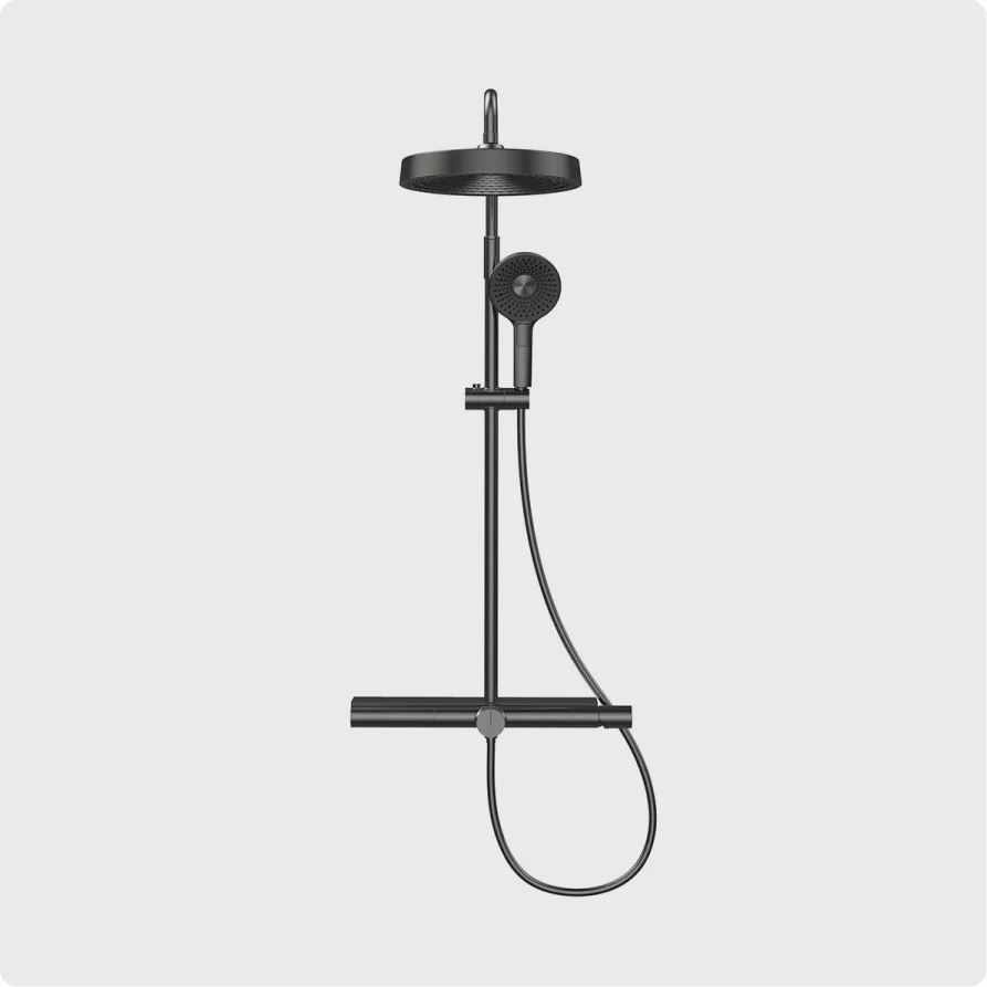 Система состоит из верхнего душа, ручного душа, смесителя для ванны и душа, штанги для душа, держателя для душа