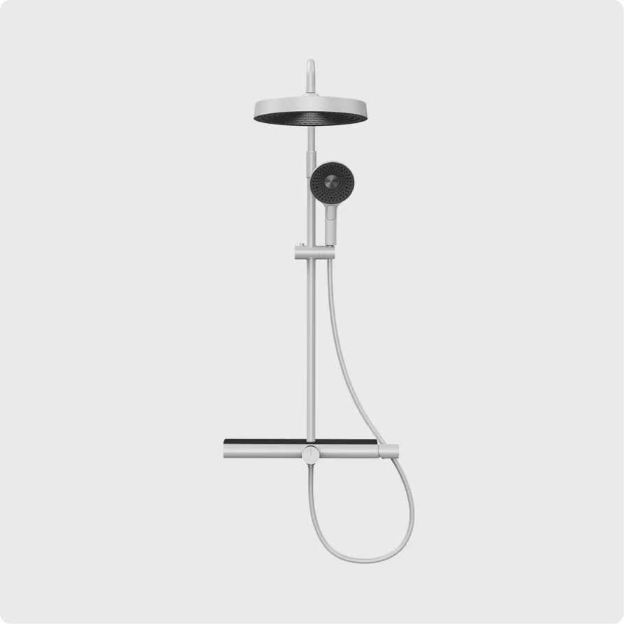 Система состоит из верхнего душа, ручного душа, смесителя для ванны и душа, штанги для душа, держателя для душа