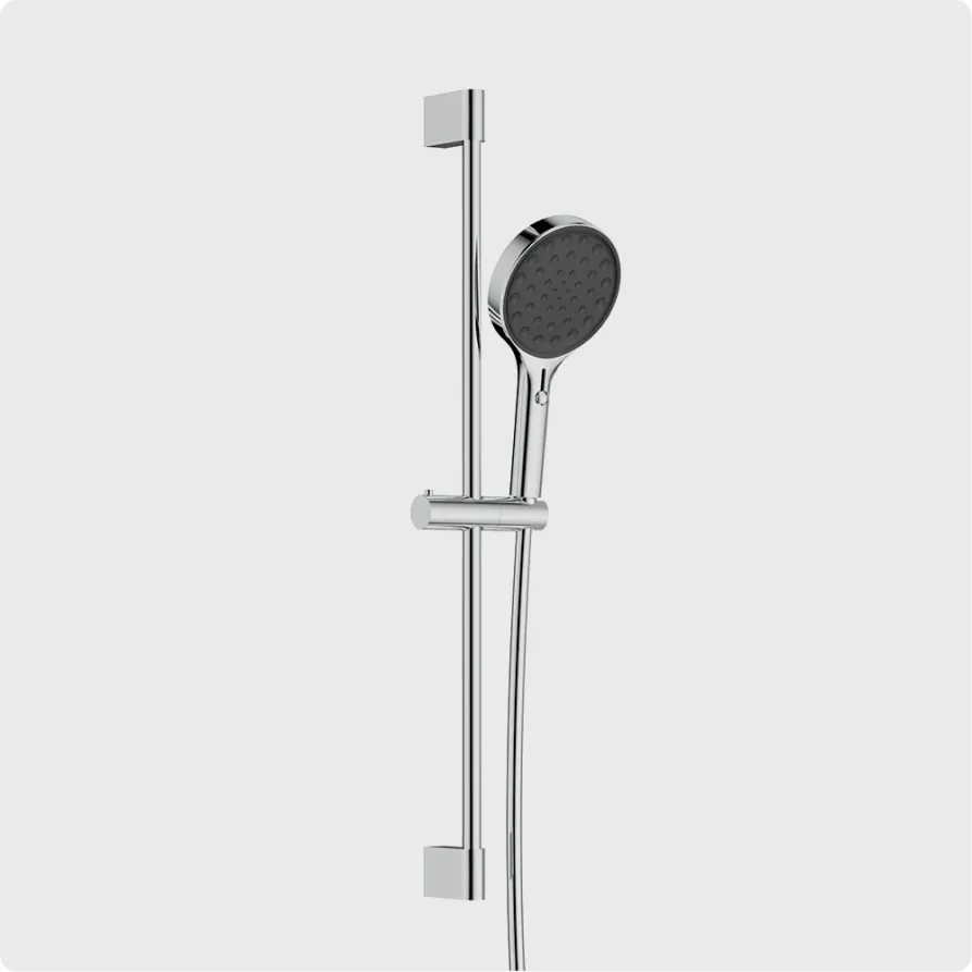 Система состоит из верхнего душа, ручного душа, встраиваемого термостатического смесителя для душа, штанги для душа, держателя для душа