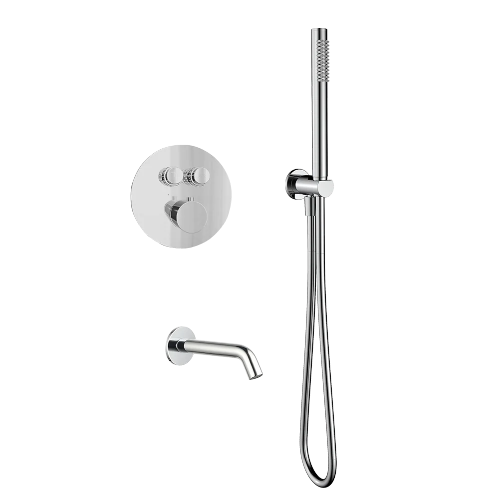 Система состоит из ручного душа, встраиваемого в стену смесителя, излива, держателя для ручного душа.