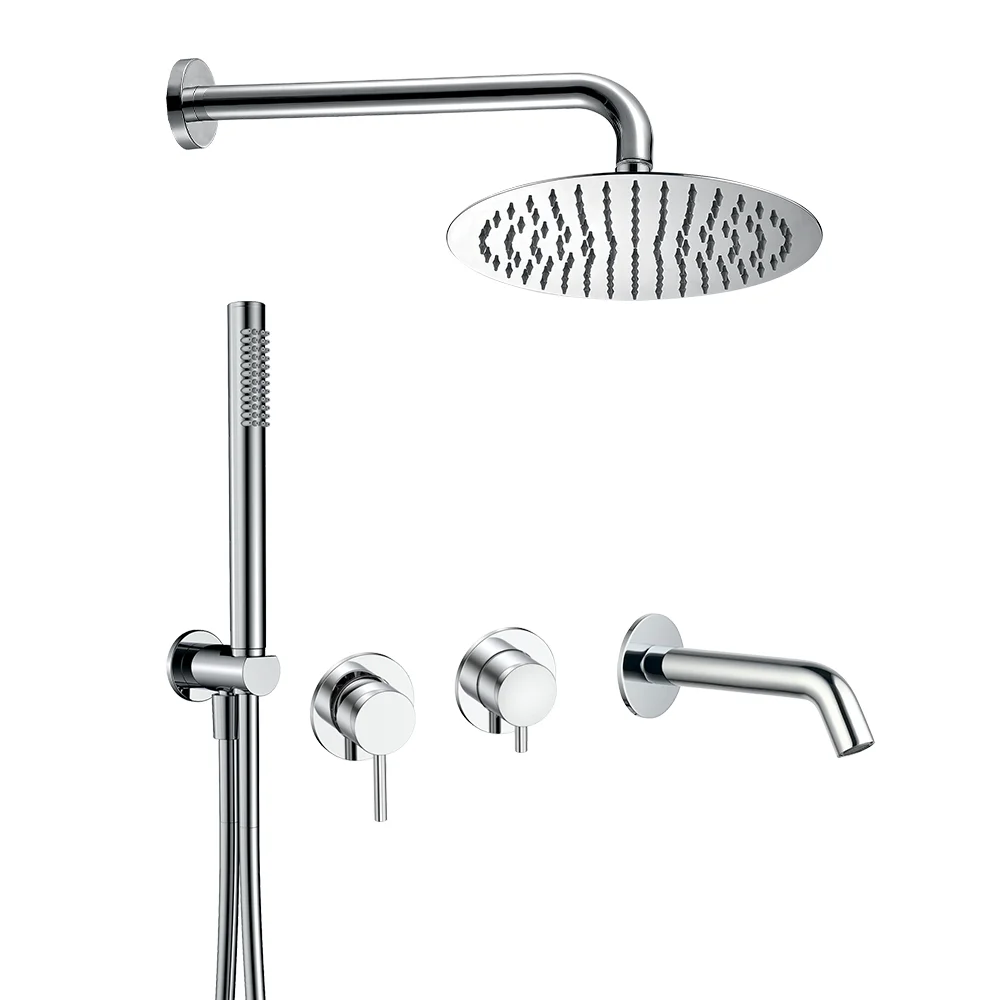 Система состоит из верхнего душа с кронштейном, ручного душа с шлангом, встраиваемого в стену смесителя с монтажной частью, излива, держателя для ручного душа.
