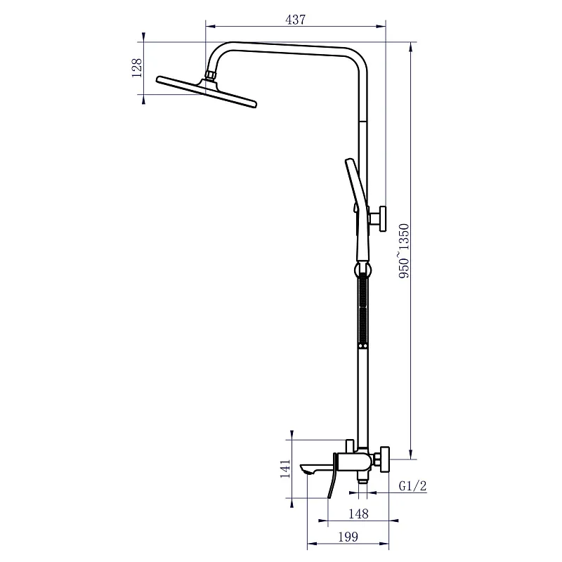 | Комплектация: | смеситель , шланг , держатель , лейка , стойка , верхний душ , излив |