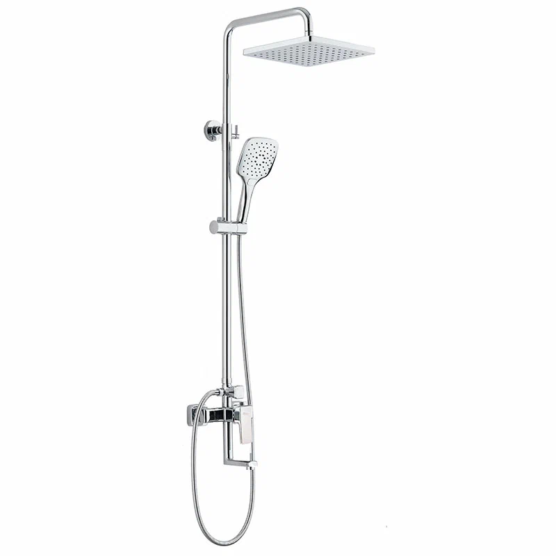 Выдвижная телескопическая стойка(нерж. сталь, хром): высота функциональная 900 -1450мм , диаметр 25мм ,вылет верхнего душа 340мм ,держатель ручной лейки плавающий FightFix Лейка верхнего душа(ABS-пластик,хром) : на подвижном шарнире, диаметр 235мм, Форсунки Self-Clean Device, Eco system Ручная лейка: диаметр 125мм, 3 режима,переключатель - кнопка, Форсунки Self-Clean Device, Eco system Cмеситель латунный с поворотным изливом: картридж универсальный 35мм , переключатель отдельный трехконтурный (ручной душ - верхний душ- излив), Комплектация: душевой шланг 150см (в металл. оплетке), монтажный комплект