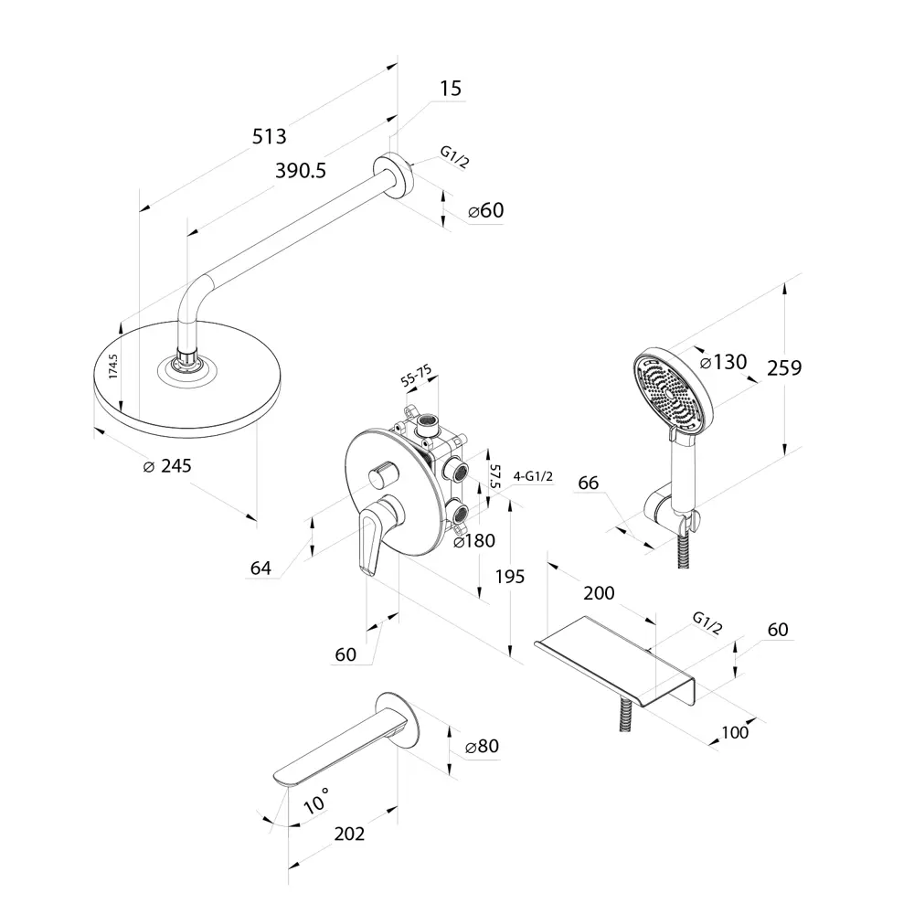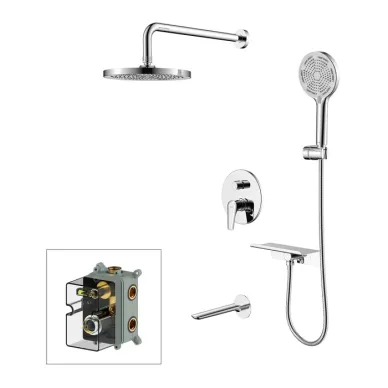 Комплектация: | излив , верхний душ , полочка , стойка , лейка , кронштейн , смеситель |