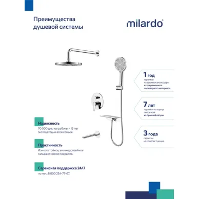 Гарантия на душевую систему Milardo® – 7 лет, на водозапорный механизм – 3 года, на душевые аксессуары – 1 год.