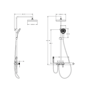 Представляем вашему вниманию элегантный и функциональный смеситель для ванны KABRERA на 4 потока, который станет украшением вашей ванной комнаты и подарит незабываемые ощущения комфорта. Смеситель для ванны включает в себя: - Верхний душ диаметром 248,46 мм: широкий поток воды из большого количества форсунок обеспечит вам полноценное наслаждение и приятный расслабляющий эффект. Специальное покрытие форсунок предотвращает образование известкового налета, продлевая срок службы изделия. - Ручной душ с переключателем режимов: эргономичная ручка и удобное крепление обеспечивают комфортное использование. Благодаря переключателю, вы можете выбрать наиболее подходящий режим струи — от мягкого до интенсивного. Размер лейки составляет 129,9 мм. - Компактную и и функциональную гигиеническую лейку, которая обеспечивает дополнительный комфорт и гигиену. - Удобную полочку: стильная и практичная полочка, позволит удобно разместить необходимые принадлежности, например, шампуни и гели для душа. - Встроенный в полочку смеситель. Смеситель оснащен керамическим картриджем, который гарантирует плавное и точное регулирование температуры и напора воды, обеспечивая долгий срок службы смесителя, а так же керамическим дивертором.