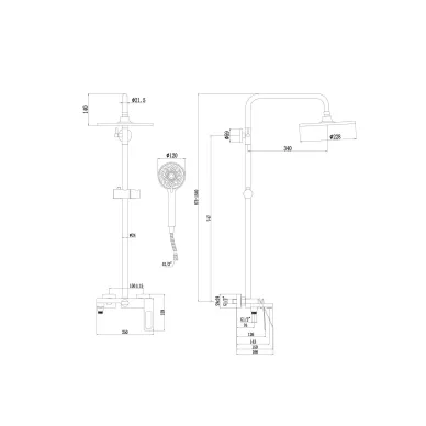 Форма верхнего душ: круглая. Диаметр верхнего душа: 228 мм. Вынос верхнего душа: 340 мм. Форма ручного душа: круглая. Диаметр лейки ручного душа: 120 мм. Регулируемый держатель ручного душа: да. Регулируемая высота стойки: да. Длина шланга: 1500 мм.