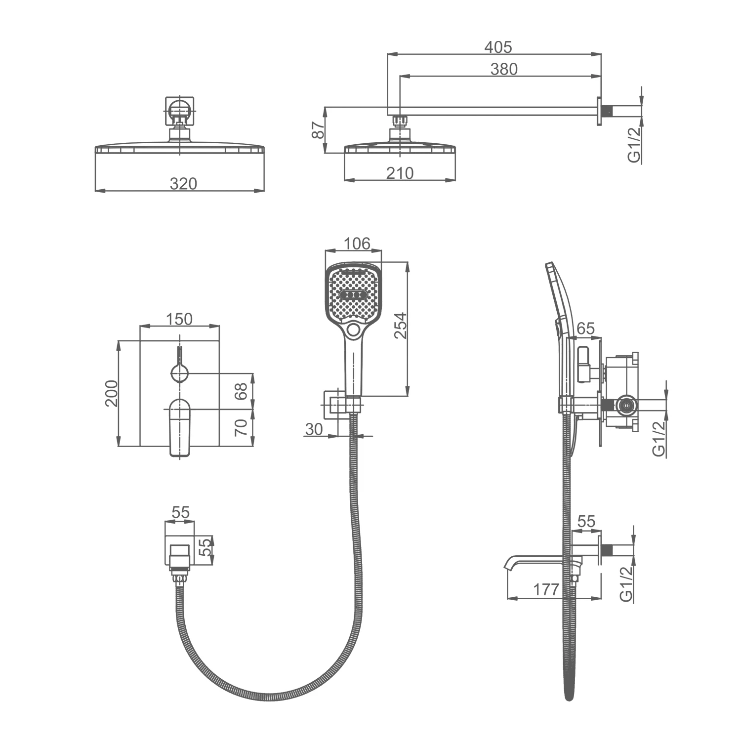 | Комплектация: | смеситель , кронштейн , шланг , держатель , лейка , верхний душ , излив |
