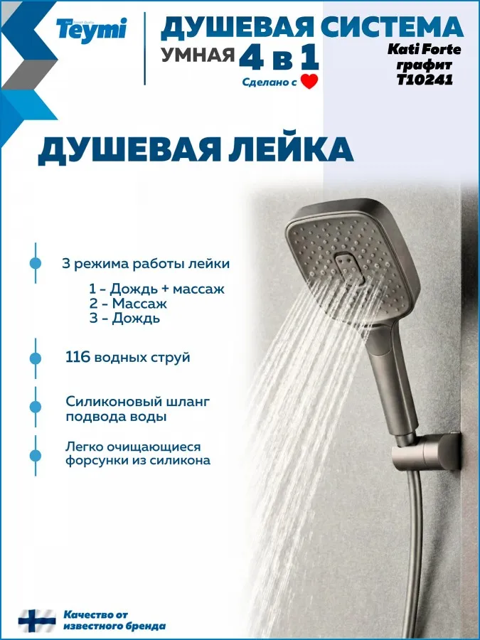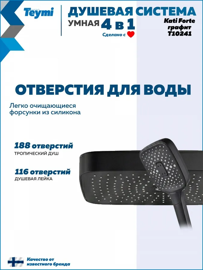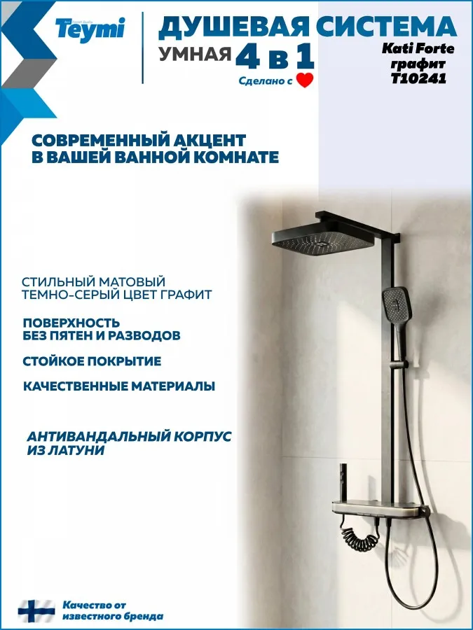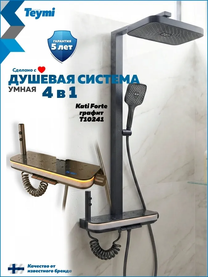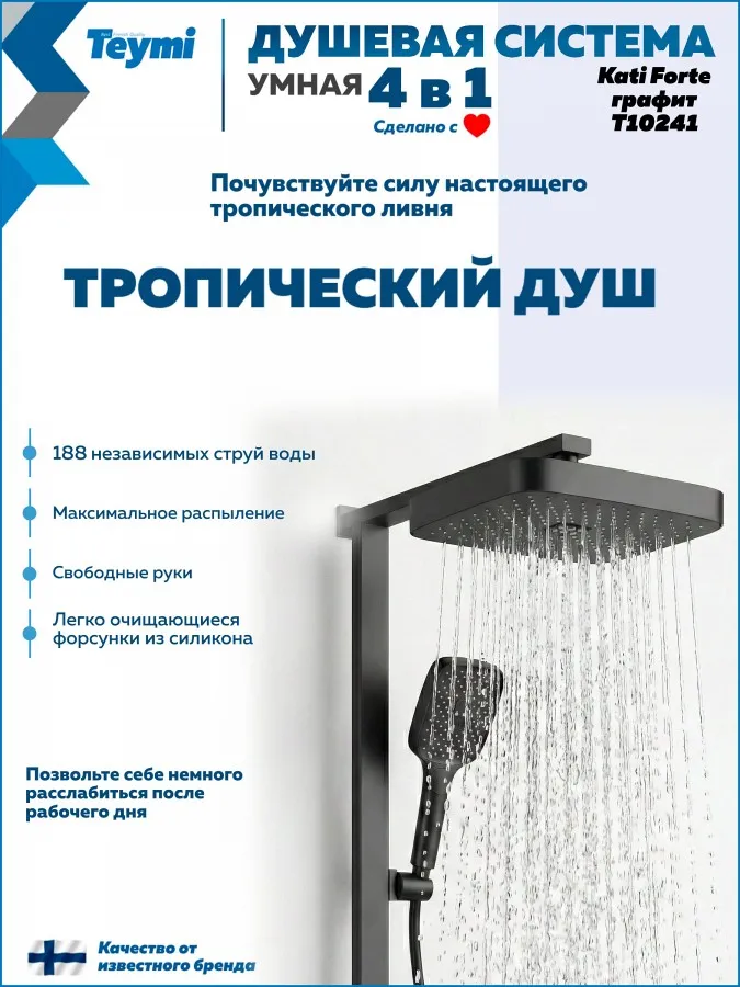 Откройте для себя новый уровень комфорта с флагманской душевой системой Teymi Kati Forte. Эта модель из коллекции Kati — самая массивная и функциональная в линейке, созданная для тех, кто не привык к компромиссам. Благородный цвет «матовый графит» и футуристичный дизайн превращают сантехнику в центральный элемент интерьера ванной комнаты.