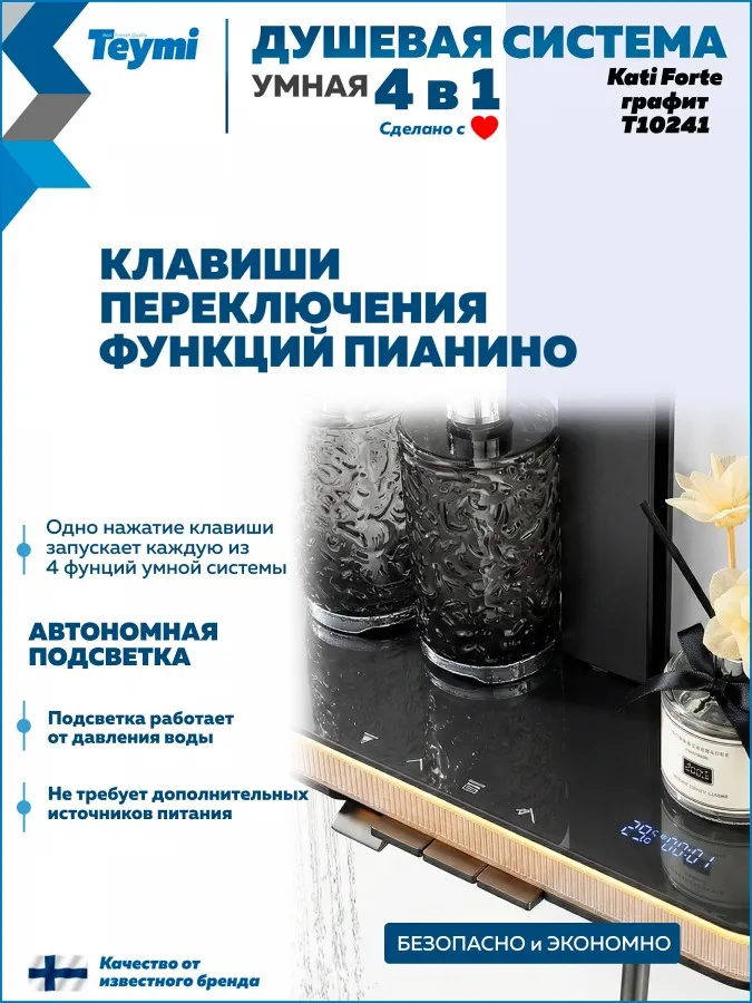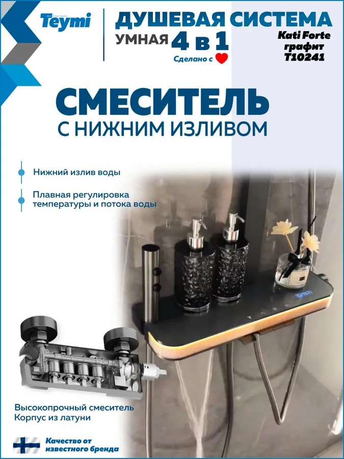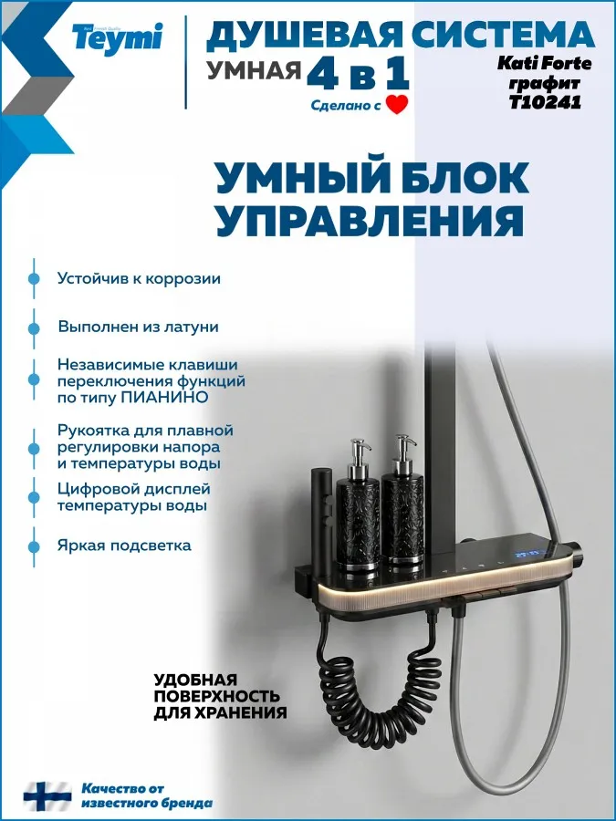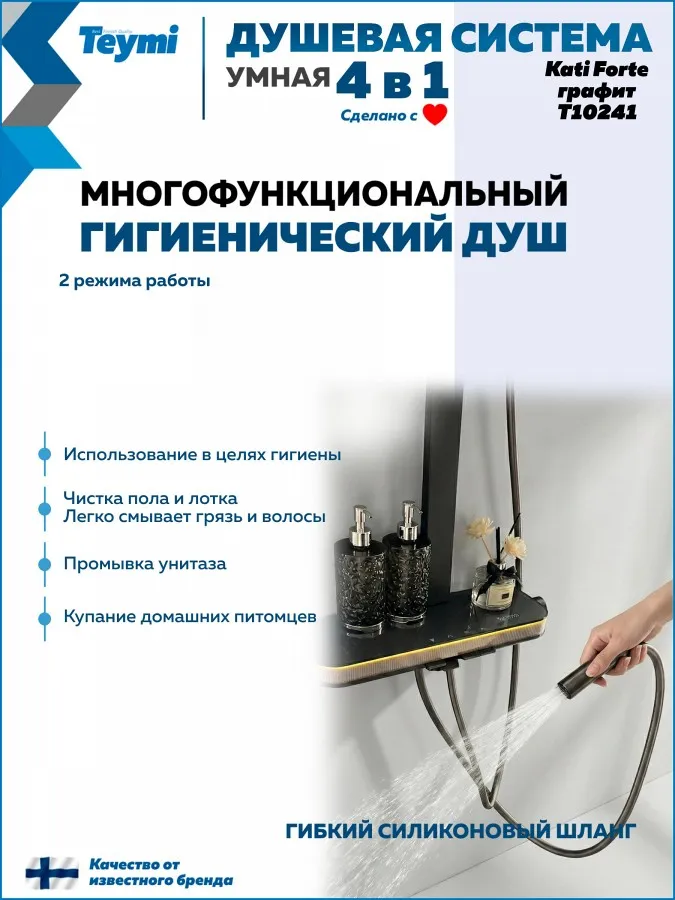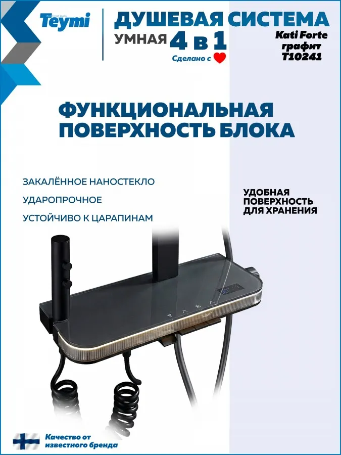 Откройте для себя новый уровень комфорта с флагманской душевой системой Teymi Kati Forte. Эта модель из коллекции Kati — самая массивная и функциональная в линейке, созданная для тех, кто не привык к компромиссам. Благородный цвет «матовый графит» и футуристичный дизайн превращают сантехнику в центральный элемент интерьера ванной комнаты.