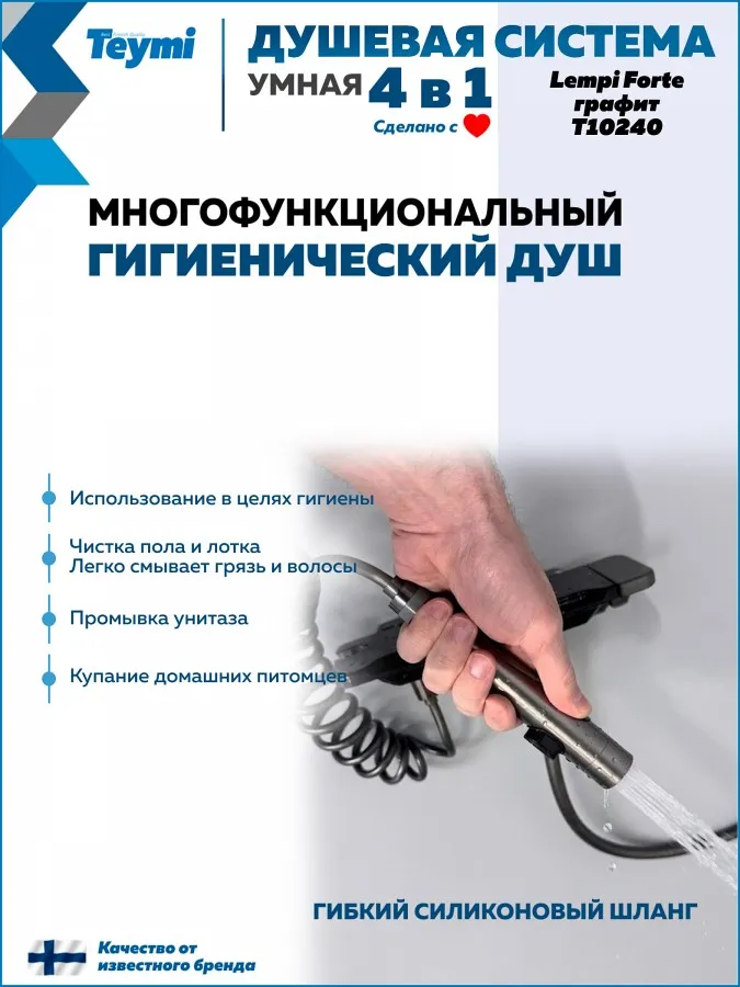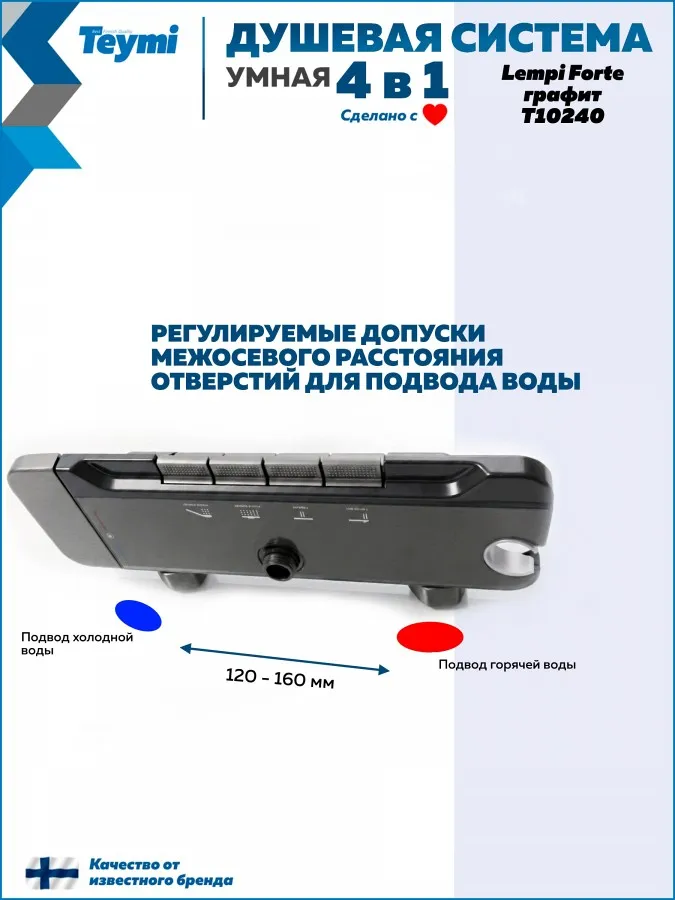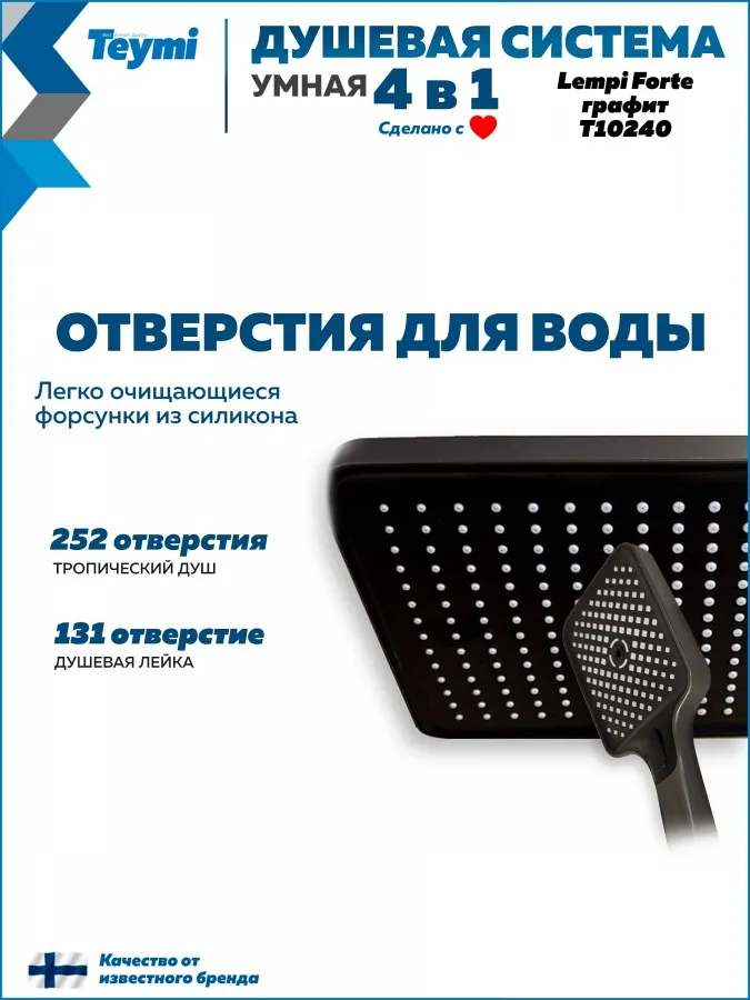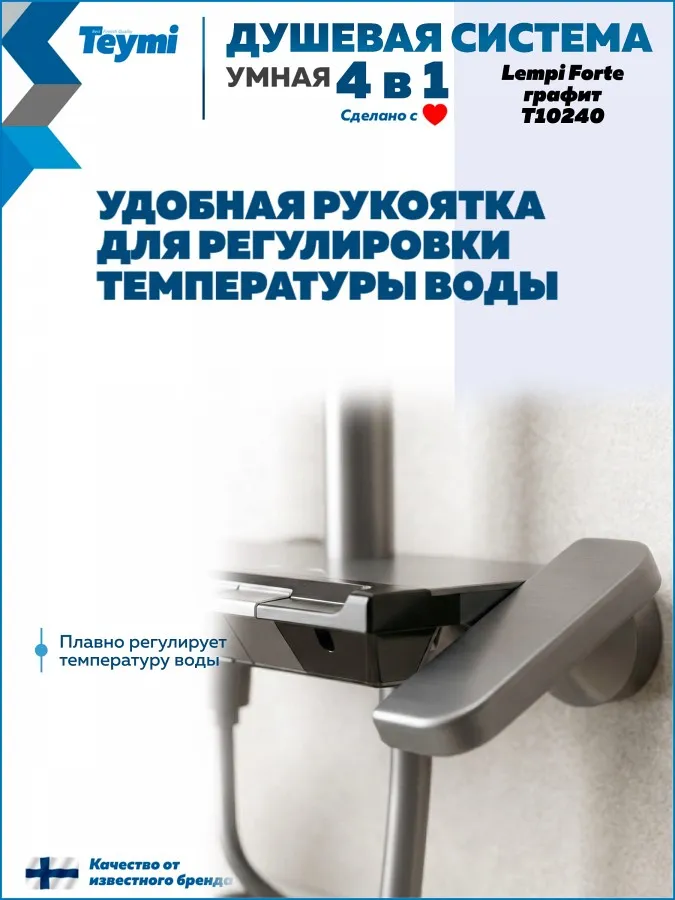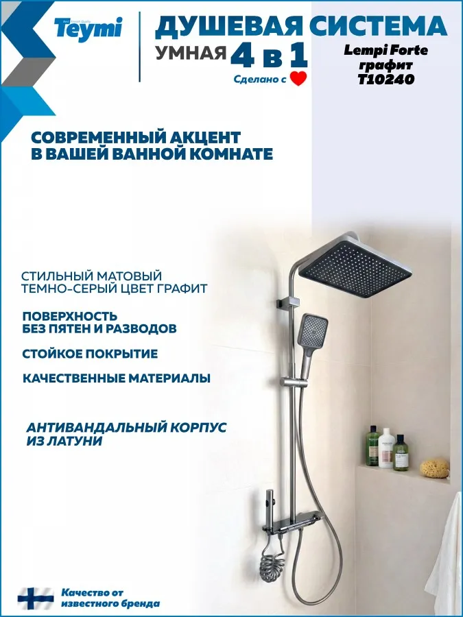 Привнесите в свою ванную комнату скандинавскую эстетику и премиальное качество с душевой системой Teymi Lempi Forte. Эта модель из коллекции Lempi выделяется компактным и продуманным дизайном в глубоком цвете «матовый графит», который идеально впишется в современный интерьер.