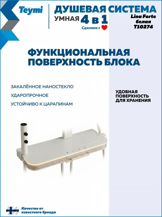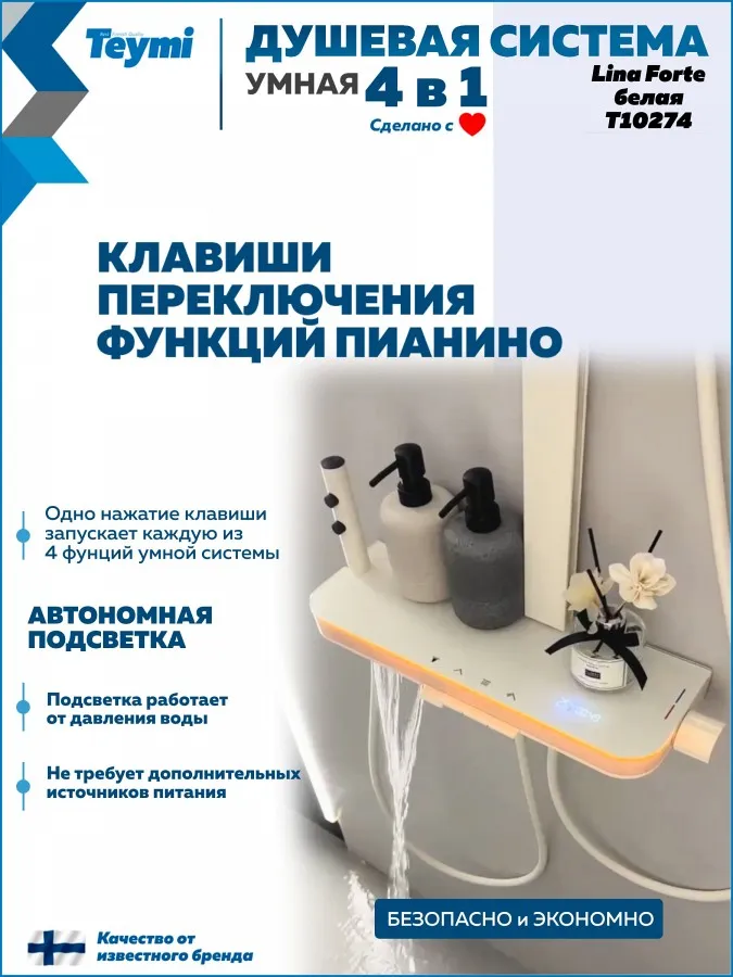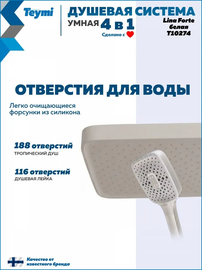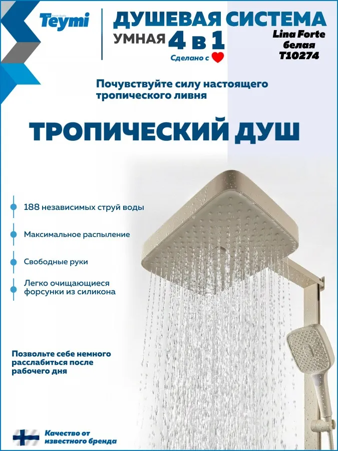 Добавьте в интерьер ванной комнаты света и уюта с душевой системой Teymi Lina Forte. Эта модель — эстетическая жемчужина коллекции, выполненная в нежном оттенке «слоновая кость». Мягкий матовый цвет и строгие прямоугольные формы идеально подойдут для интерьеров в стиле сканди, прованс или неоклассика, визуально расширяя пространство.