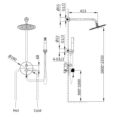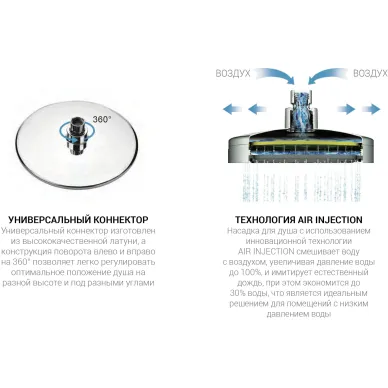 Состав комплекта: верхний душ, ручной душ, смеситель