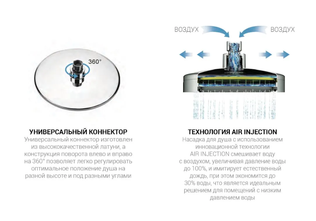 Состав комплекта: верхний душ, ручной душ, смеситель