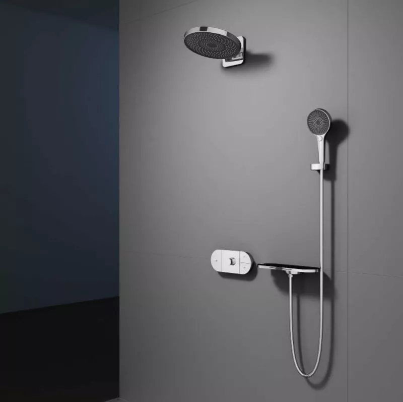 - Комплектация: Верхний душ, полка с изливом и держателем ручного душа, ручной душ, смеситель со встраиваемой частью