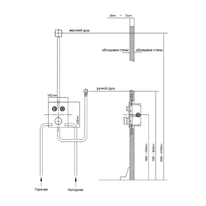 - Комплектация: Верхний душ, держатель ручного душа, ручной душ, встраиваемый смеситель