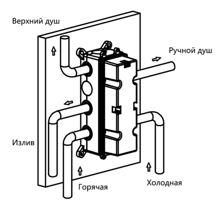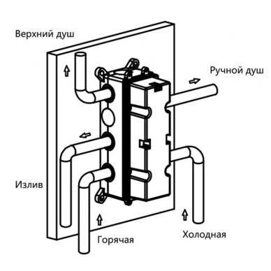 - Комплектация: Верхний душ, держатель ручного душа, ручной душ, смеситель со встраиваемой частью, излив