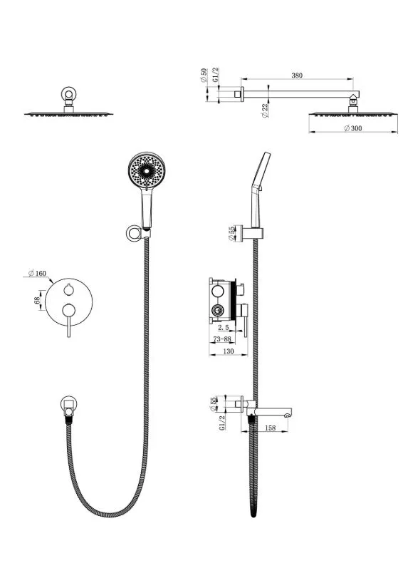 Комплектация: | излив , верхний душ , лейка , держатель , шланг , механизм , кронштейн , смеситель |