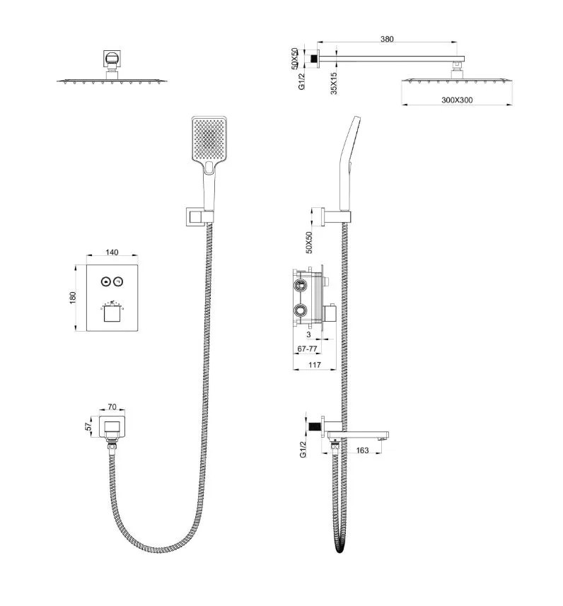 | Комплектация: | излив , верхний душ , лейка , смеситель , термостат , кронштейн , механизм , шланг , держатель |