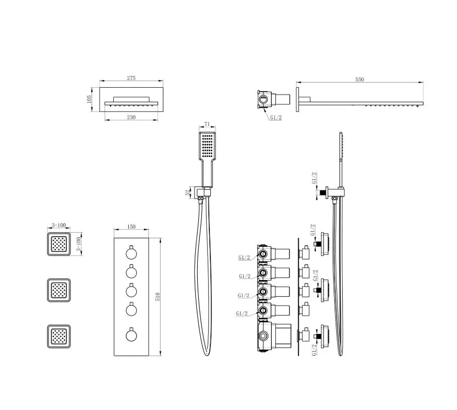 | Комплектация: | верхний душ , лейка , смеситель , механизм , шланг , держатель |