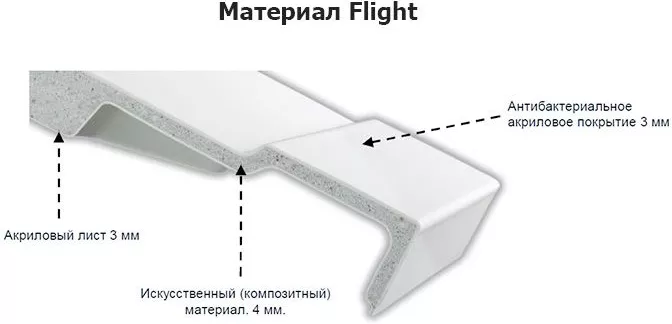 Flight представляет собой уникальный материал, патент которого принадлежит компании Jacob Delafon. Его состав включает два слоя чистого литьевого акрила толщиной 3 мм, между которыми располагается слой композита толщиной 4 мм. Материал очень прочный. Преимуществом такого сочетания является надежность, устойчивость, легкость. Акриловая отделка предотвращает сколы и обеспечивает изделие матовой с антискользящим покрытием поверхностью, которую легко чистить. Специальное антибактериальное покрытие BioCote с ионами серебра уменьшает уровень возникновения бактерий на 99,9%. Заглушка слива у поддона со специальным съемным фильтром для волос. Ячеистая структура поддона обеспечивает наилучшее соотношение веса и габаритной жесткости.