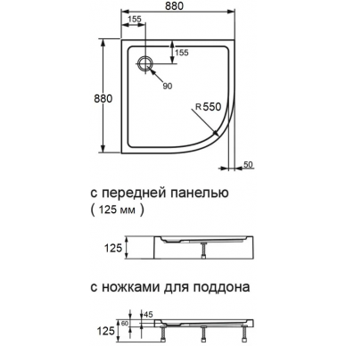 - Модель имеет стандартную форму четверти круга с боковыми сторонами 88 сантиметров, высота поддона - 12,5 см, глубина поддона - 4,5 см.